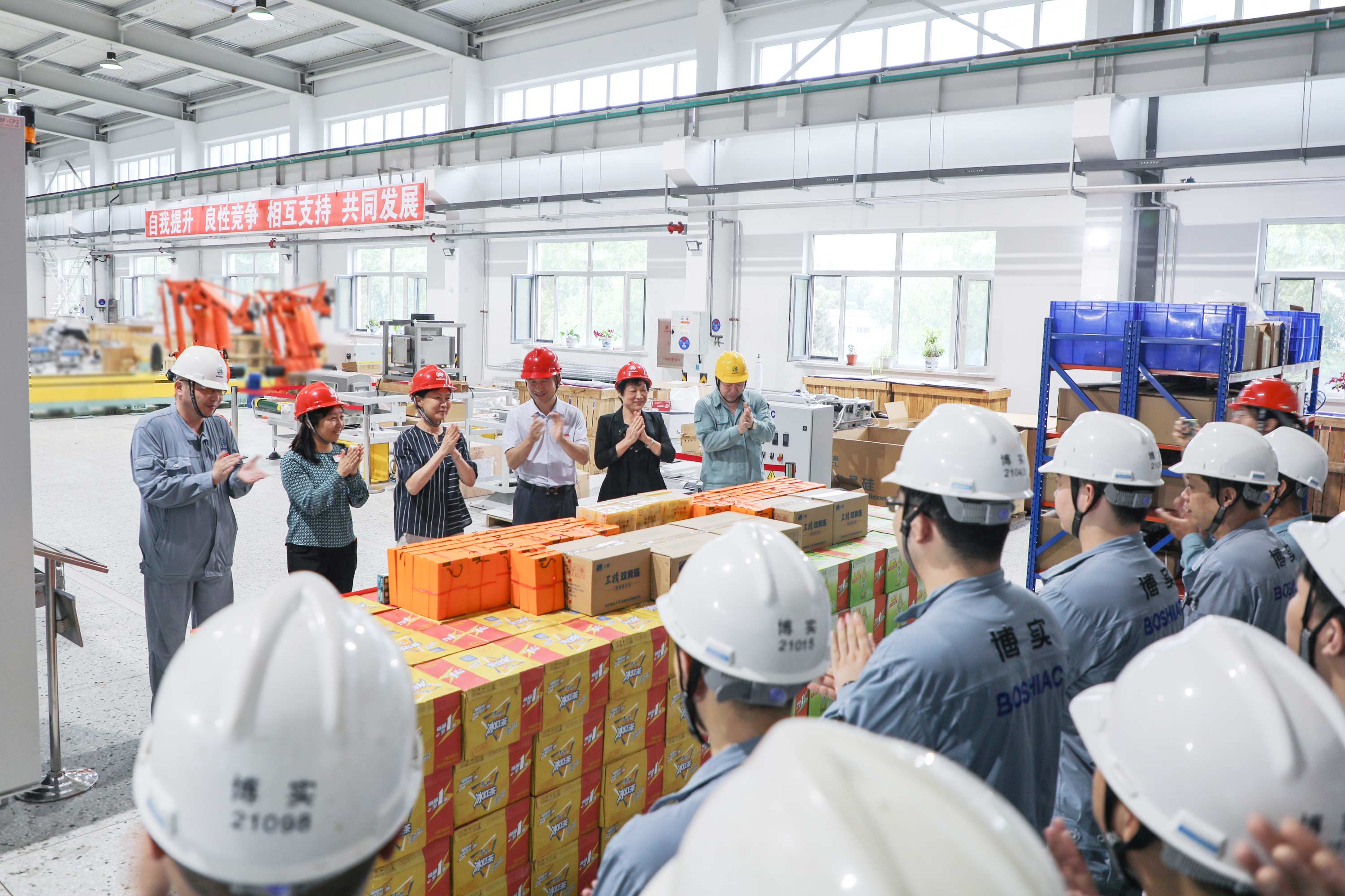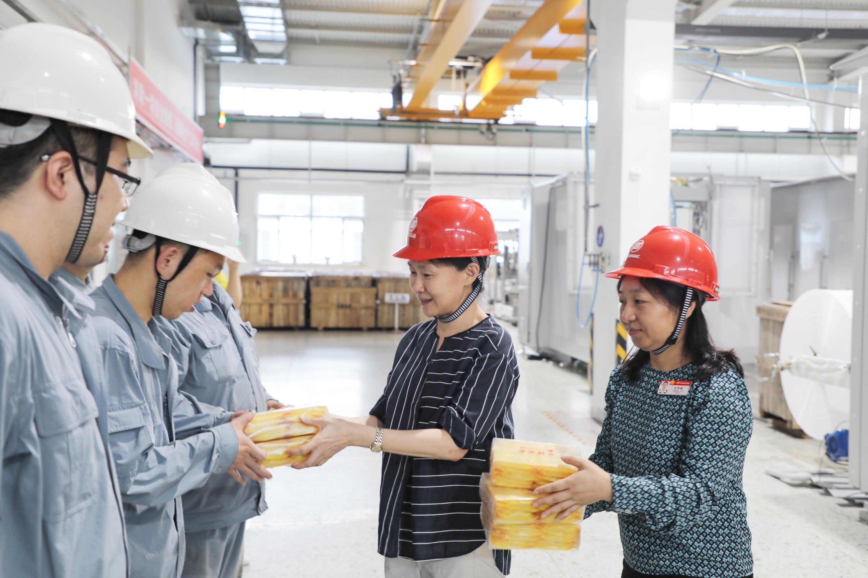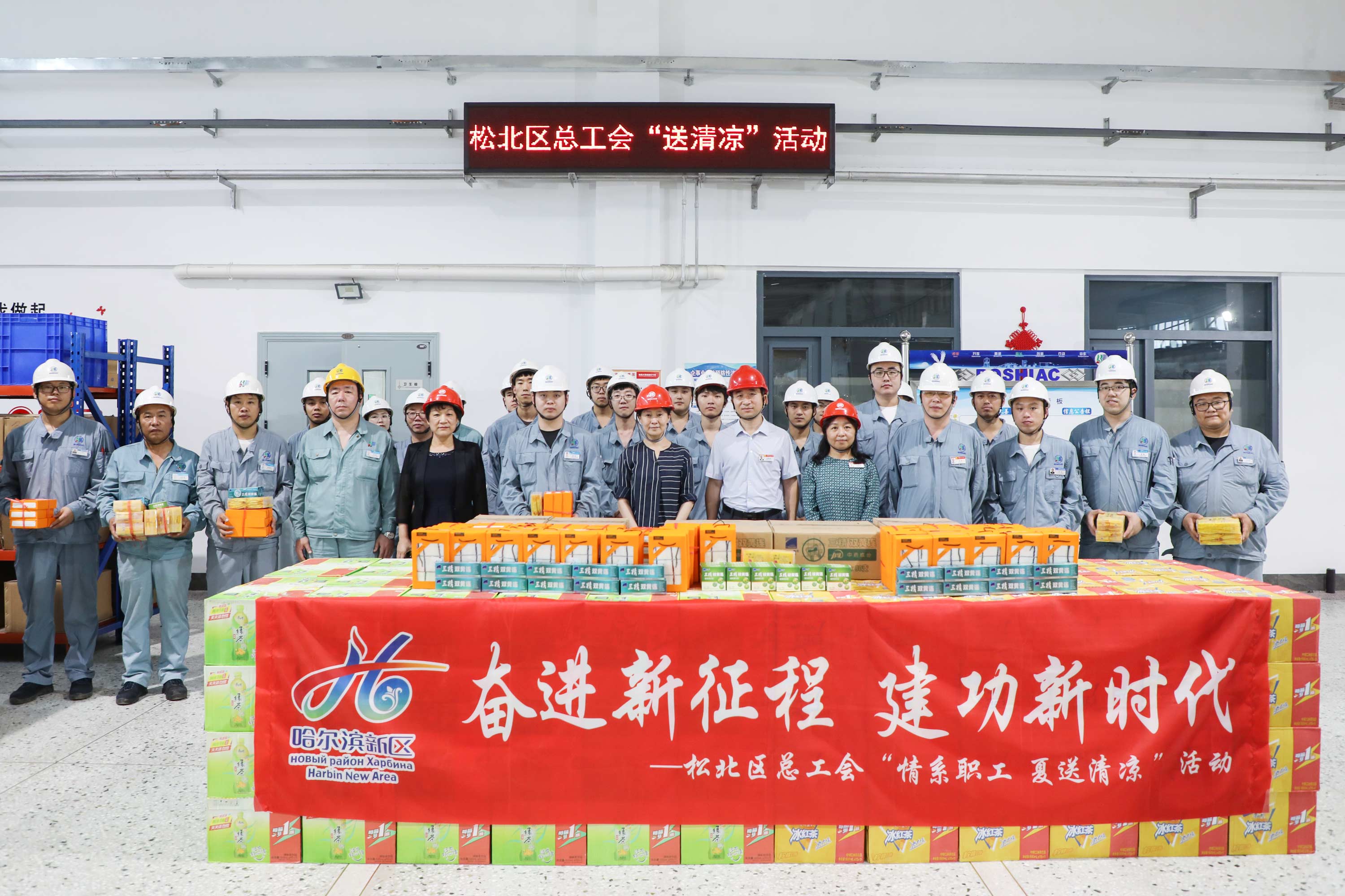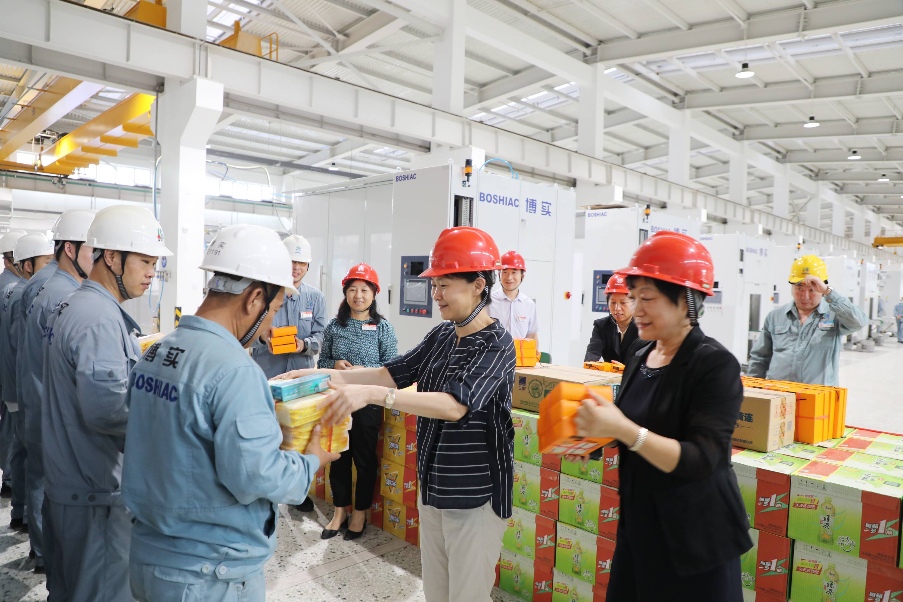8月8日下午,哈爾濱市新區黨工委副書記、松北區委副書記黃明瑾,松北區總工會主席鄭奎秀及相關負責同志蒞臨博實,為奮戰在車間的生產安裝部職工送來了防暑降溫用品。