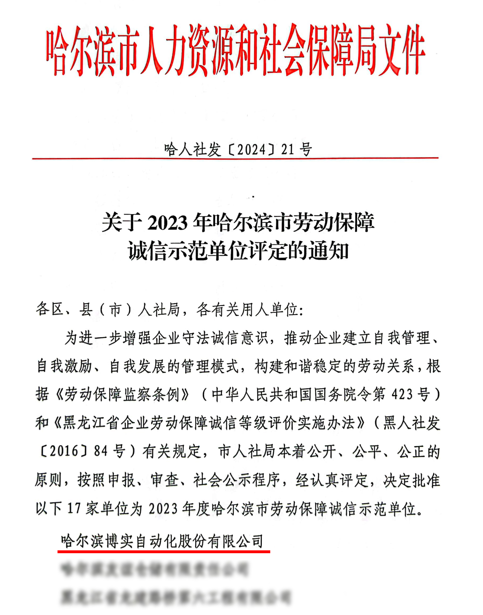 哈爾濱市人力資源和社會保障局公布2023年哈爾濱市勞動保障誠信示范單位名單,博實股份入列。